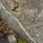 While exploring the outcrop an interesting vein was discovered with lots of gossen and calcopyrites. As I was sampling vein, calcopyrites and green powder fell from the vein, it was full of green powder, the find was a green monster.
